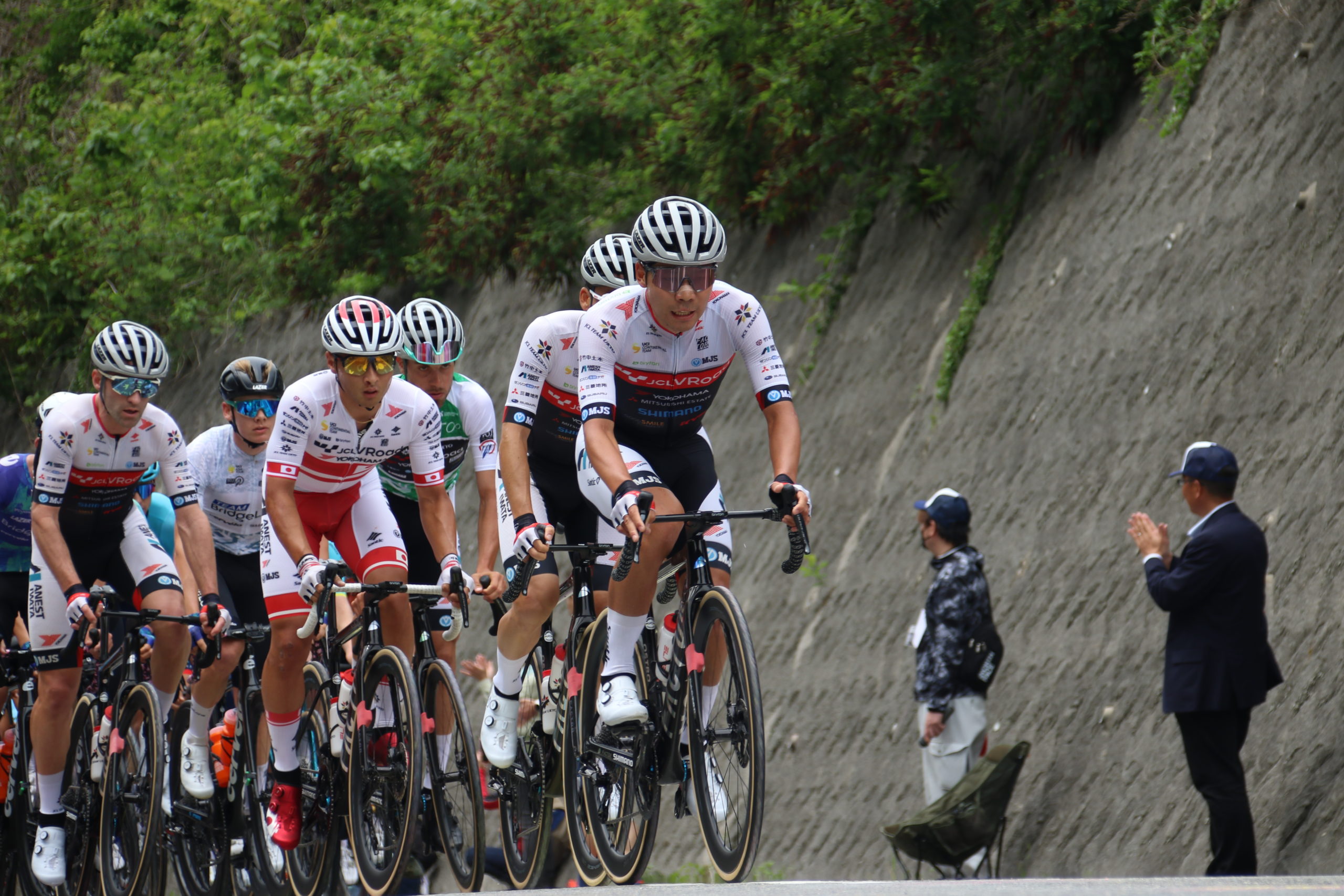 選手たちの走りを、正面から、横から、そして遠くからも見渡すことができ、シャッターチャンスもばっちり。スピードに乗って坂を駆け上がってくる集団は、まるで風のかたまりのようです。